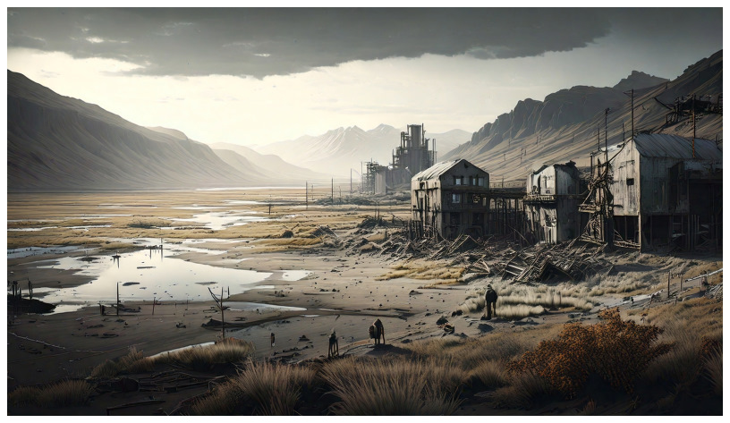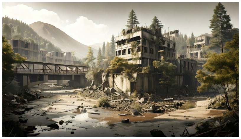 The fun thing about generating these AI images is that they sometimes come up with details that I would never have thought of, such as the dried-up river in "A Bridge Too Far" below or the slag heaps in "So Long Soglio". On the other hand, the AI that I was using was sometimes quite resistant to the prompts that I was using. The image that I had in mind for "Aescher in Ashes" was one like this old Chinese house dwarfed by modern tower blocks, but the AI had something else in mind and I really liked the result.
