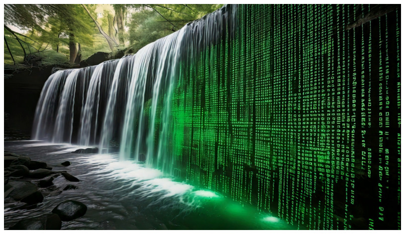 The Four-Falls hike in Bannau Brycheiniog (formally known as the Brecon Beacons) encompasses this wonderful flow on the Mellte river. Somehow, the curtain of water brought to mind the data flow depiction in the Matrix films - probably due in part to the green moss, prompting me to use the AI to generate this Matrix-like data flow